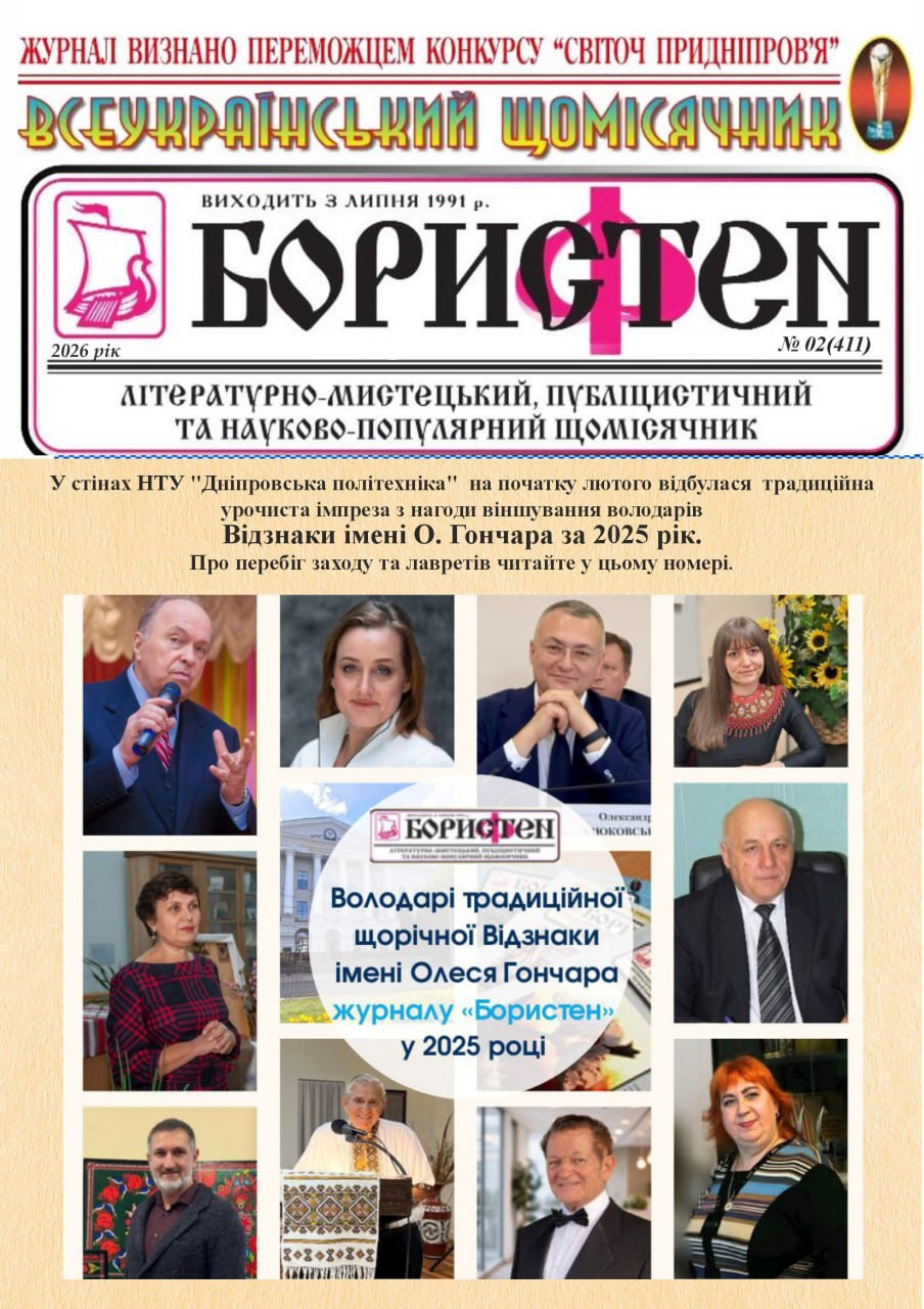 За роки свого існування журнал став трибуною наукових і творчих сил не лише країни, а й світової української діаспори. “Бористен” надходить у 33 держави світу. У 2002 році щомісячник став переможцем у конкурсі “Світоч Придніпров’я” в номінації “Кращий журнал регіону”. А у 2003 році журнал став дипломантом Всеукраїнського конкурсу Національної Спілки журналістів України “Українська мова – мова єднання”. Силами редакції часопису “Бористен” проводяться різноманітні літературно-мистецькі імпрези. Журнал заснував конкурс імені Олеся Гончара та Відзнаку Івана Багряного.