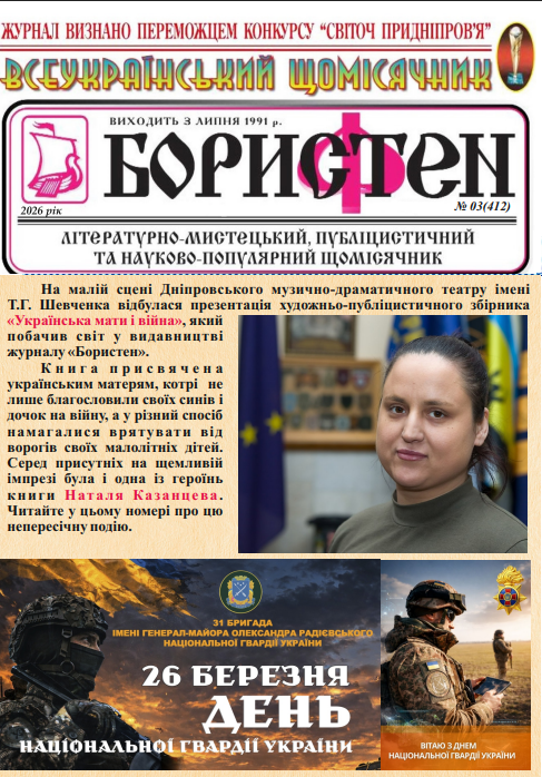 За роки свого існування журнал став трибуною наукових і творчих сил не лише країни, а й світової української діаспори. “Бористен” надходить у 33 держави світу. У 2002 році щомісячник став переможцем у конкурсі “Світоч Придніпров’я” в номінації “Кращий журнал регіону”. А у 2003 році журнал став дипломантом Всеукраїнського конкурсу Національної Спілки журналістів України “Українська мова – мова єднання”. Силами редакції часопису “Бористен” проводяться різноманітні літературно-мистецькі імпрези. Журнал заснував конкурс імені Олеся Гончара та Відзнаку Івана Багряного.